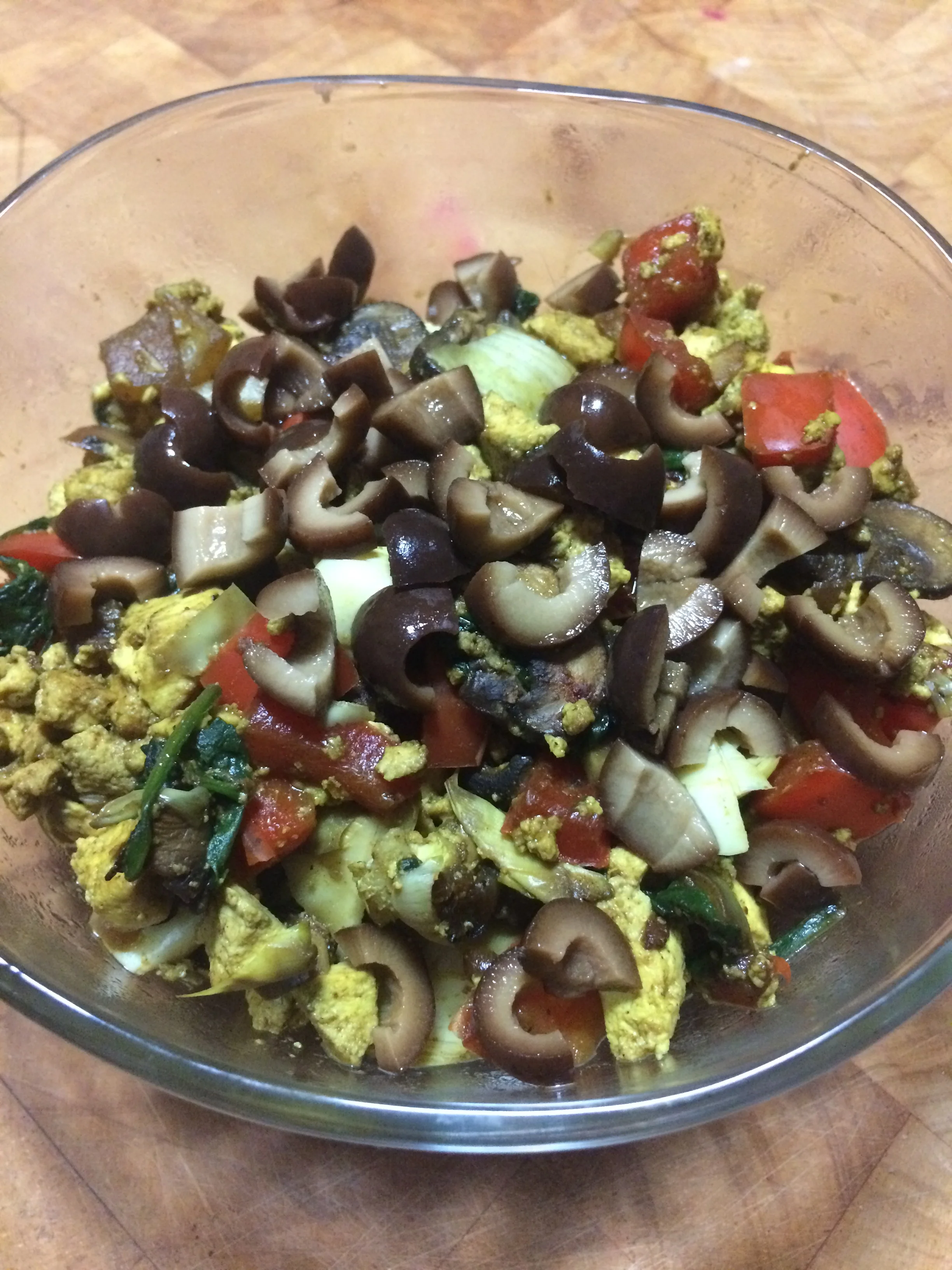 Begin by heating a skillet over medium high heat. I use a cast-iron skillet for all of my frying because I don't like to use oil if I can avoid it. Open your package of tofu and pour the water off. Flip the block of tofu onto 2 folded and stacked paper towels to remove the excess water, and let it sit while you prepare the vegetables. Add the onion and mushrooms to the pan and allow to cook 5 minutes or so, until the onions are translucent. Next, add the chopped peppers, artichokes, and the garlic to the pan and sauté until the onions and mushrooms begin to brown. Once the veggies are about done, add your greens to the top of the mixture and cover, allowing the greens to wilt. Once the greens have steamed and become brightly colored, stir them in, then remove the mixture from the pan and set aside. Add the tofu block to the pan and begin smashing and crumbling it with your spatula until you achieve your desired size pieces. Once the tofu is crumbled, sprinkle the ground turmeric and salt on top, and stir until all of the tofu pieces are yellow. (This is how we fool omnivores into thinking we're eating eggs.) The tofu will only need to cook for a few minutes. I cook mine until it appears to dry out. When the tofu is hot and looks dry, add the veggies back into the pan and stir well to combine. Remove from the heat and serve. Scrambles go well with sprouted grain toast, baked home fries, or more vegetables, and are awesome at any time of day. Try adding a nut-based cheese, olives, tomatoes, or sprouts to the top for even more flavor.